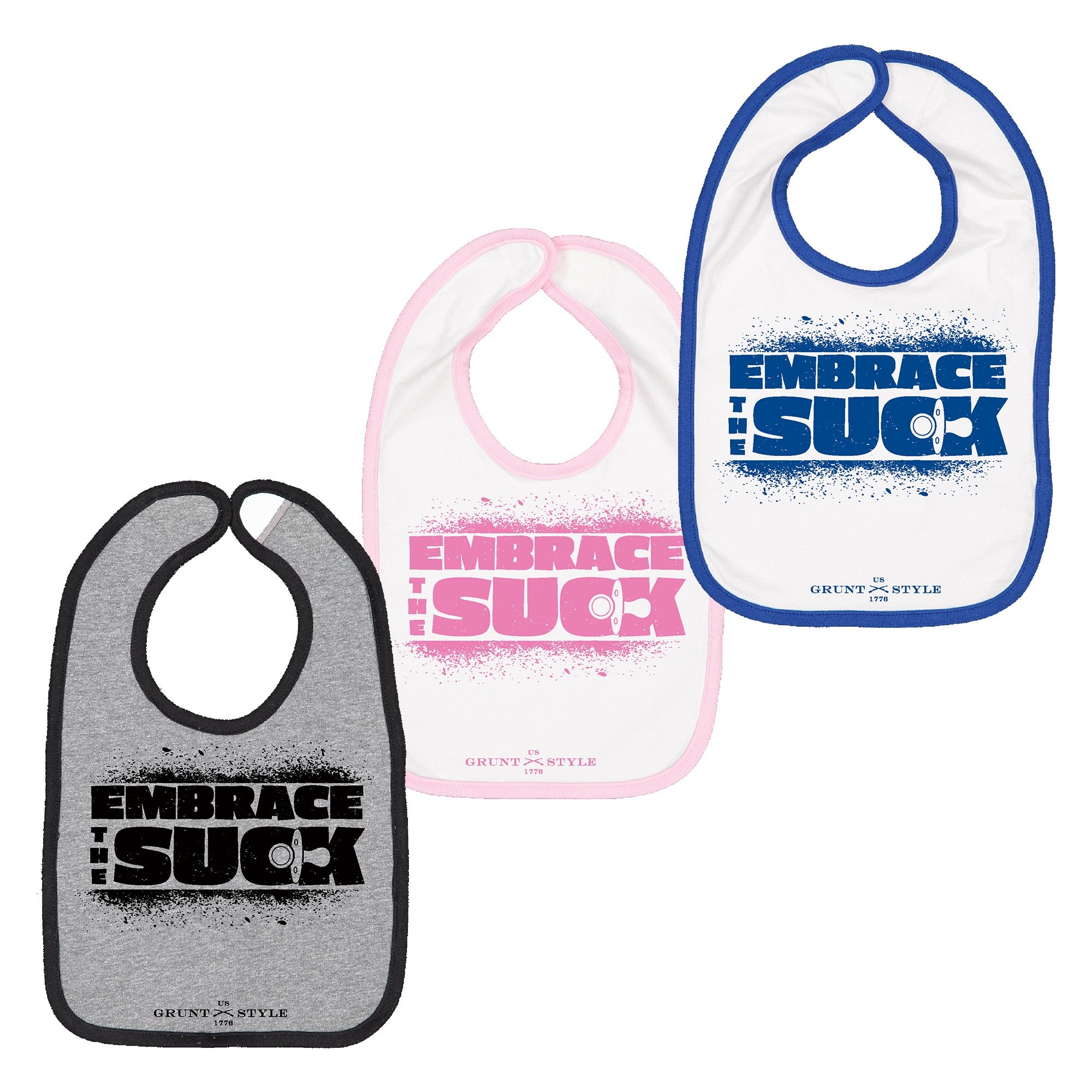 Runt Style's Embrace The Suck Bib is the perfect pairing, catch all bib for the little patriot in your life.